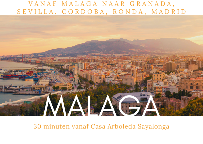 Malaga is een prachtige stad gelegen aan het strand en slechts 2,5 tot 3 uur vliegen. Heerlijk langs de kustlijn fietsen, onderweg tapas eten, genieten van strandjes en de zon. Vanaf Torre del Mar (30 minuten) en Malaga (60 min) zijn er bus of treinverbindingen naar andere prachtige steden zoals Sevilla (3 uur) Granada (1,5 uur) en Cordoba (2 uur). Wijzelf hebben vanaf Sevilla de trein genomen naar Cordoba en vervolgens naar Malaga. Zeer goed geregeld. Een andere goede optie is om naar Madrid te vliegen, vervolgens de trein te nemen (3 uur) en Malaga en andere steden te bezoeken. Vergeet onze casa niet en huur een auto om door een authentiek Spanje te toeren en bezoek witte dorpjes met adembenemende vergezichten en historische plekjes zoals Archez, Arenas, Canillas de Albaida, Corumbela, Sayalonga, Torrox, Competa en Frigiliana en meer..